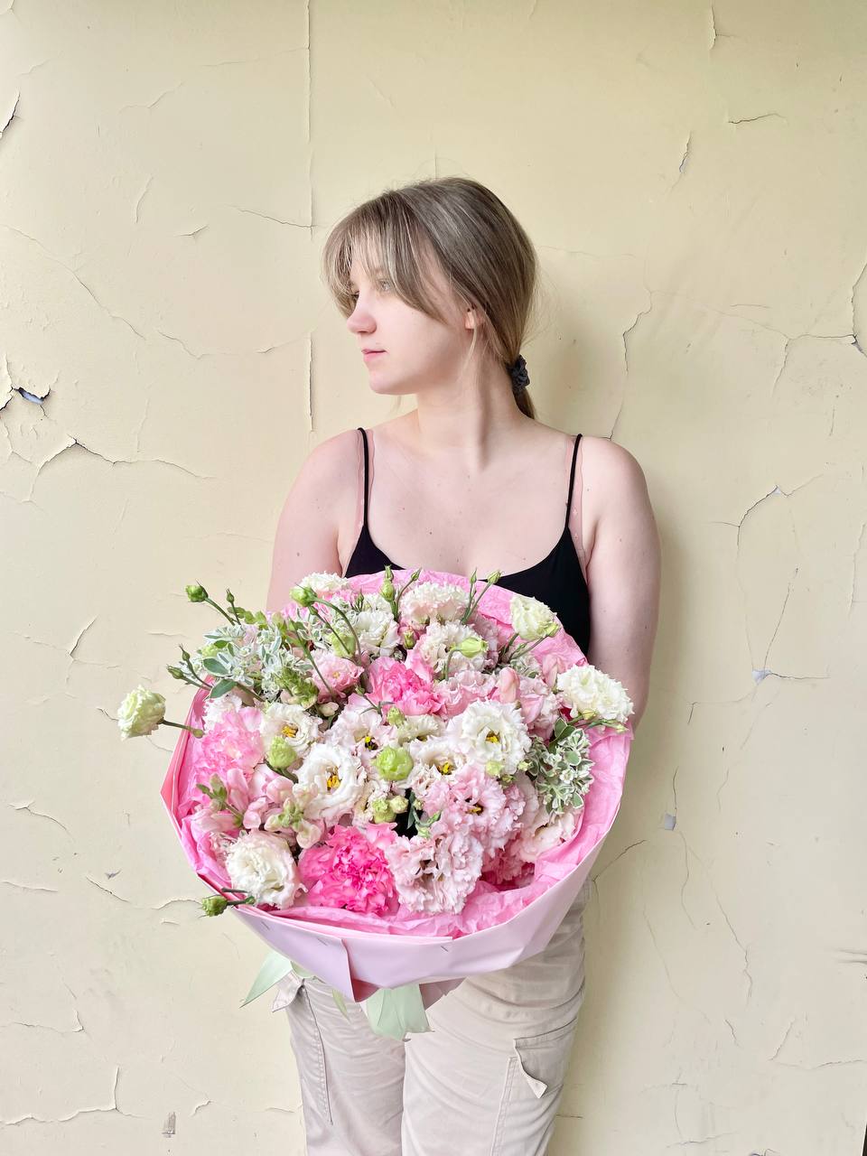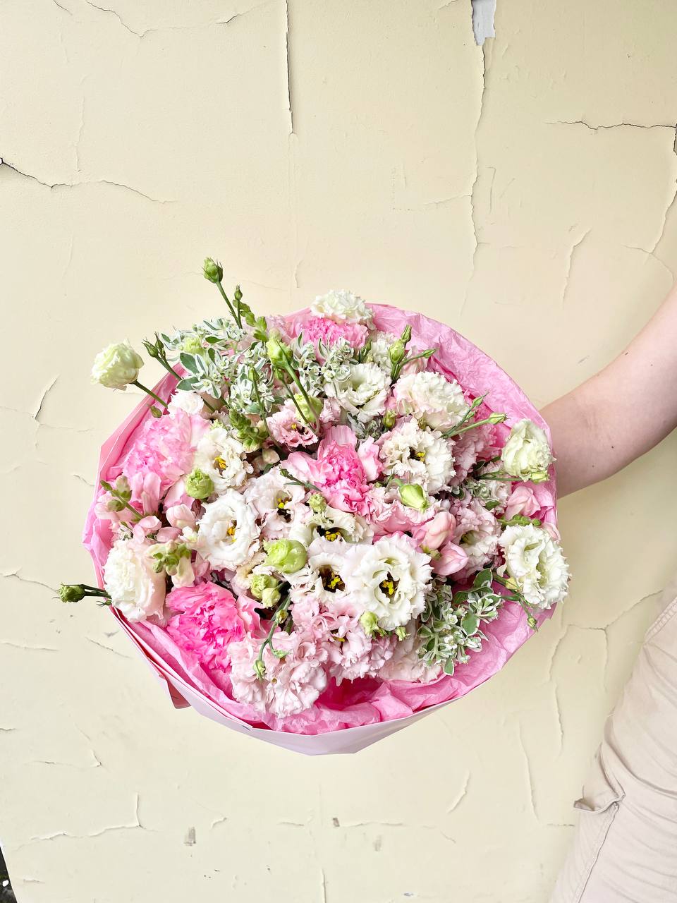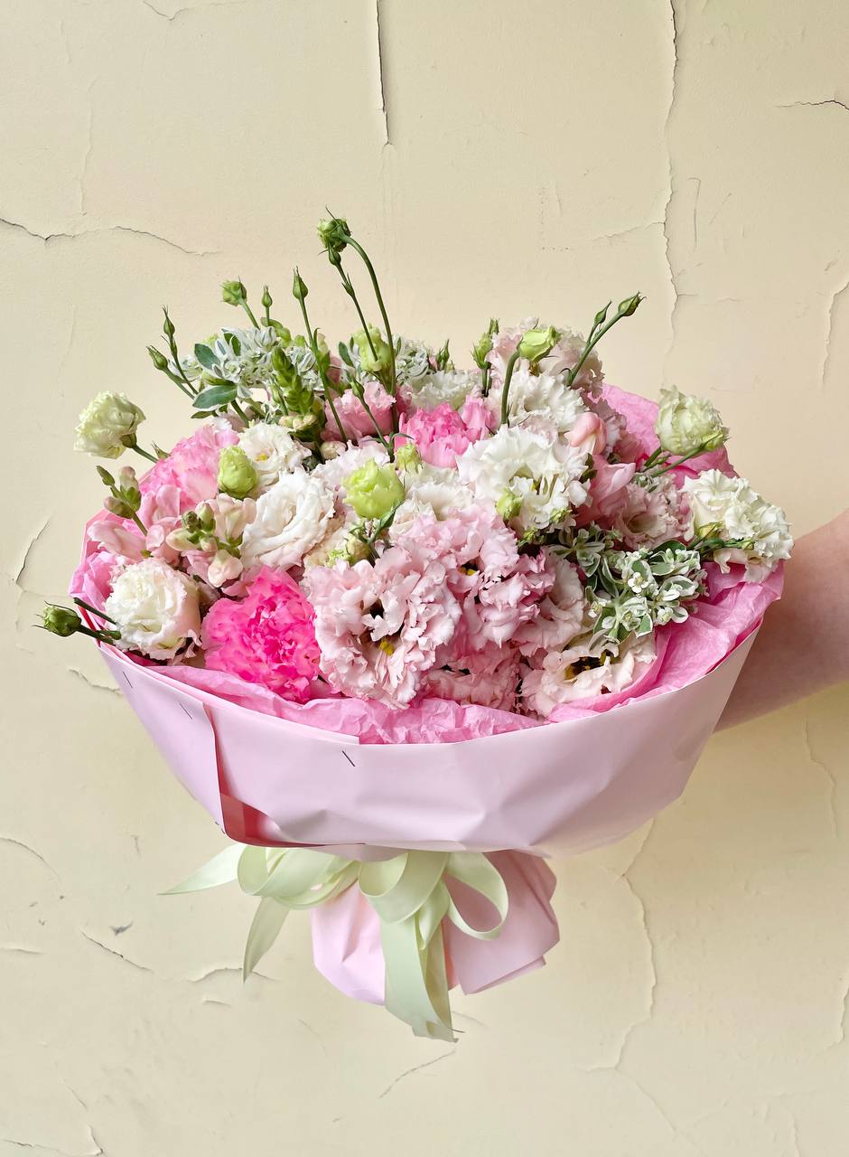 Состав букета: кремовая эустома, розовый антирринум, солидага, пушистые колоски.