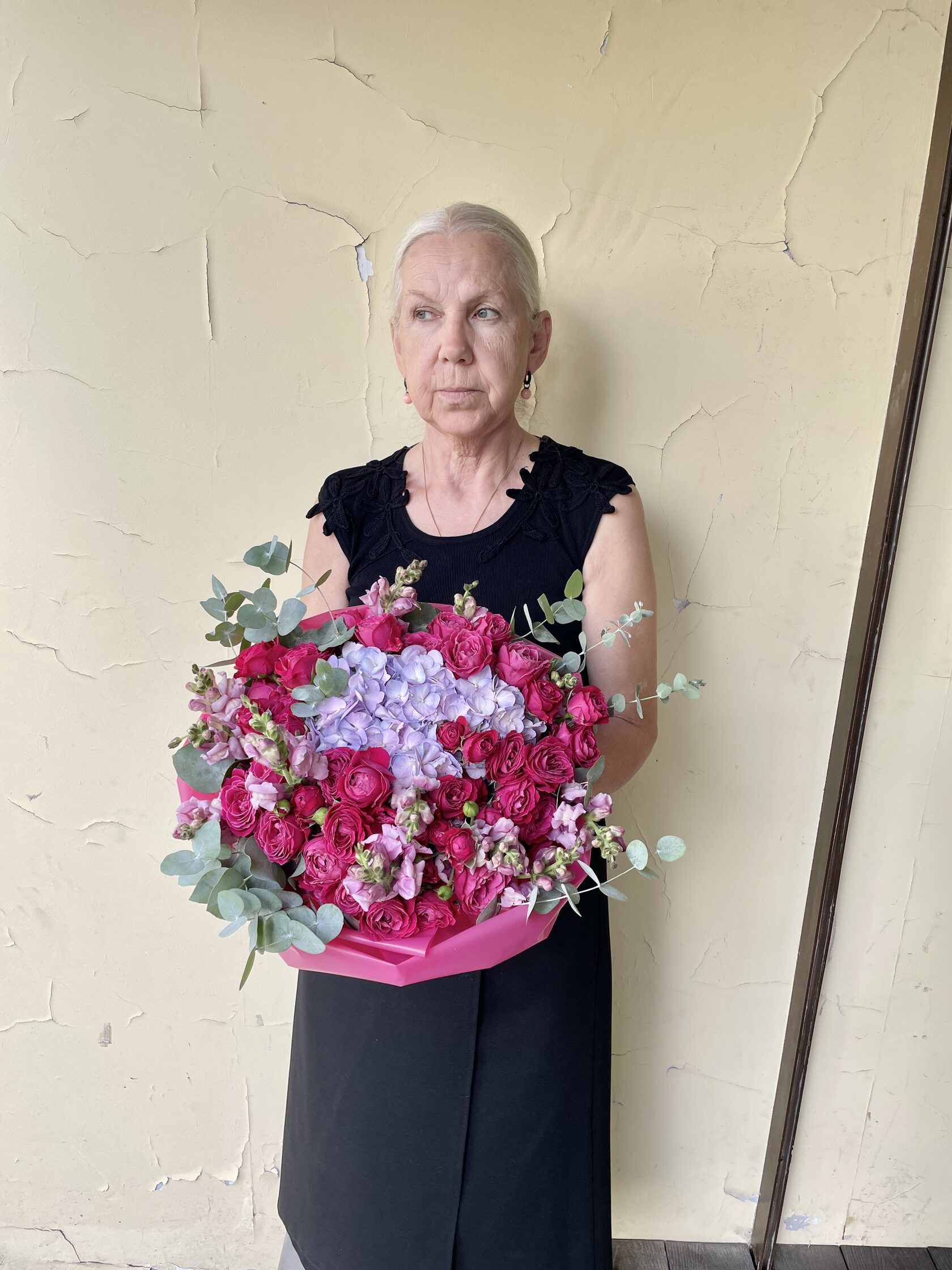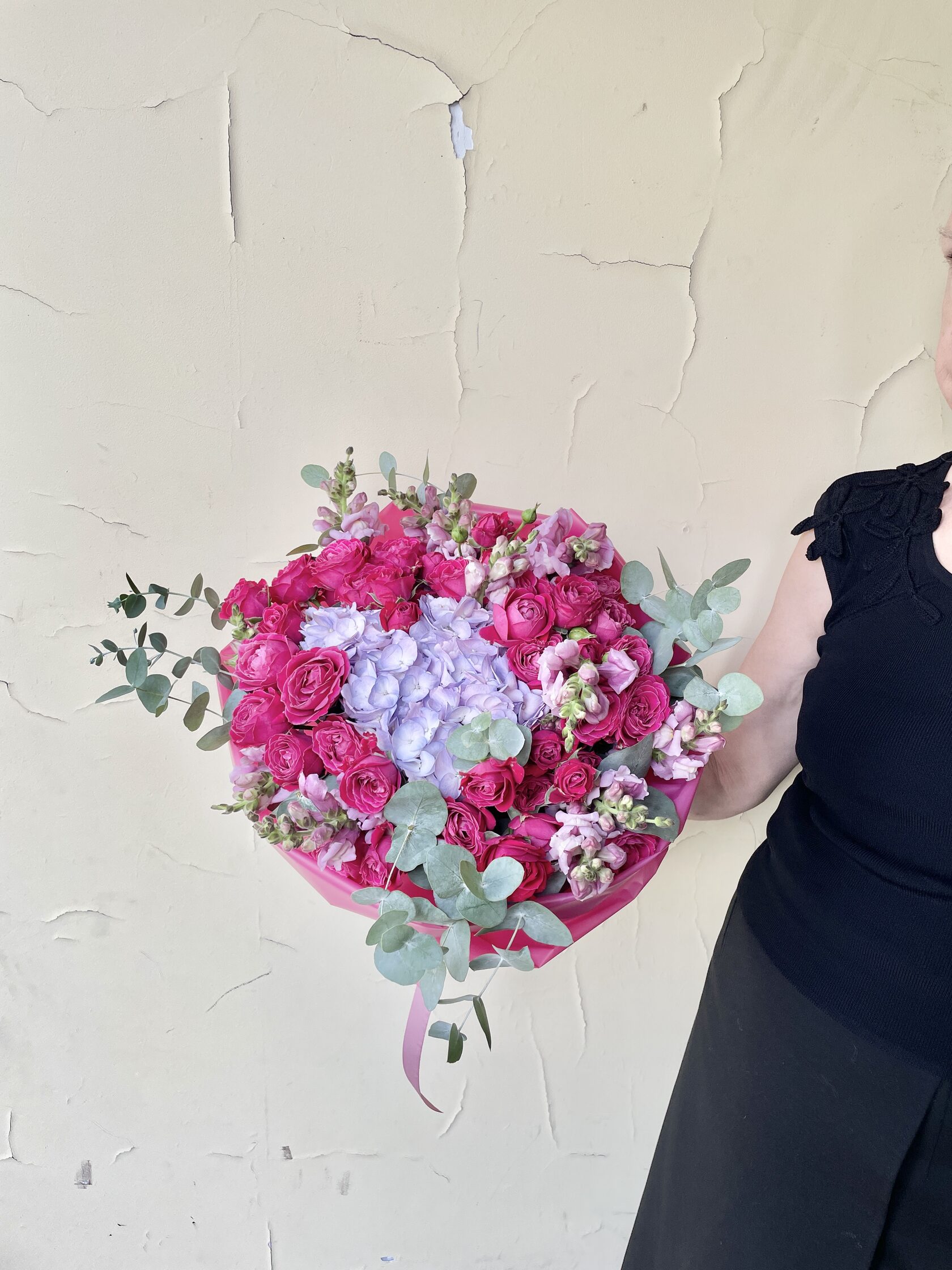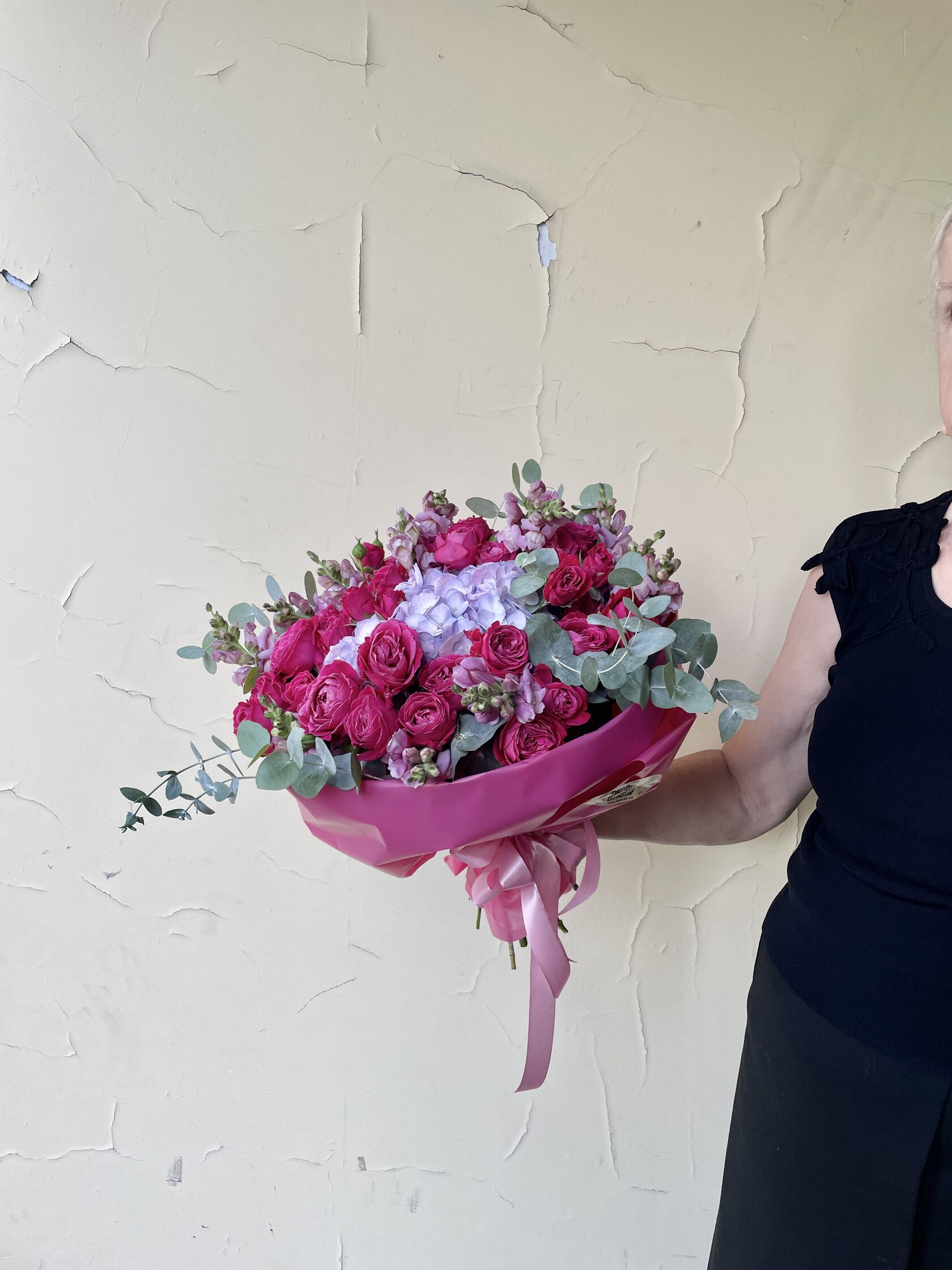 Состав букета: розовая гортензия, розовый диантус, красный амарант, розовая эустома, нежно розовые кустовые розы, листья малины.