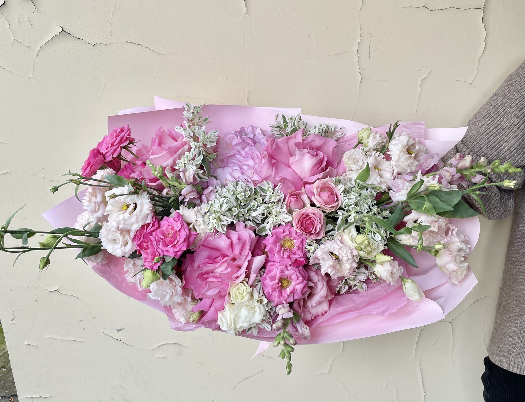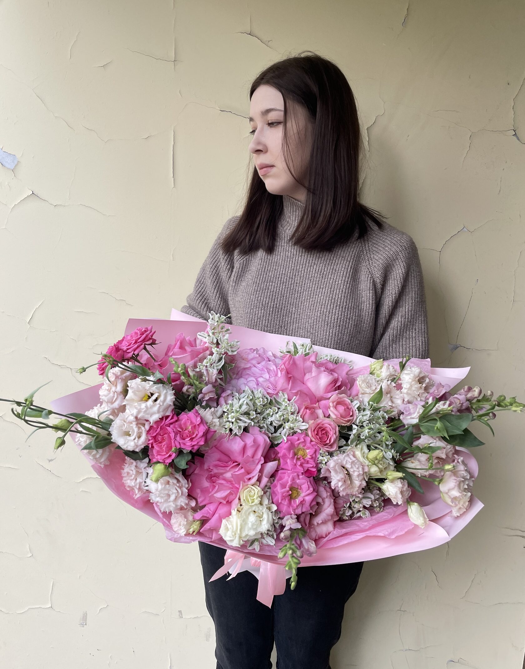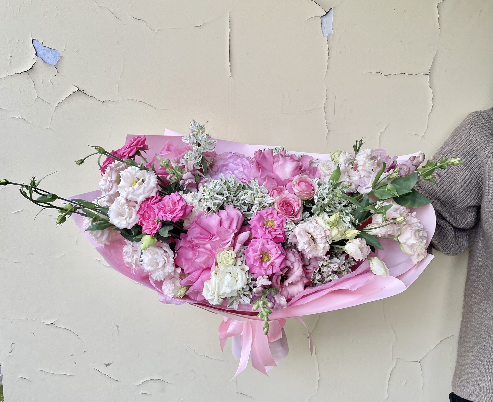 Состав букета: розовая гортензия, розовый диантус, красный амарант, розовая эустома, нежно розовые кустовые розы, листья малины.