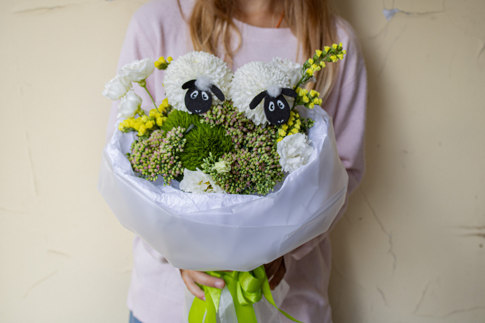 Состав букета: Хризантема мокко, эустома, статица, седум и зеленая гвоздика. Букет упакован в стильную упаковку белового цвета и перевязан шелковыми лентами.