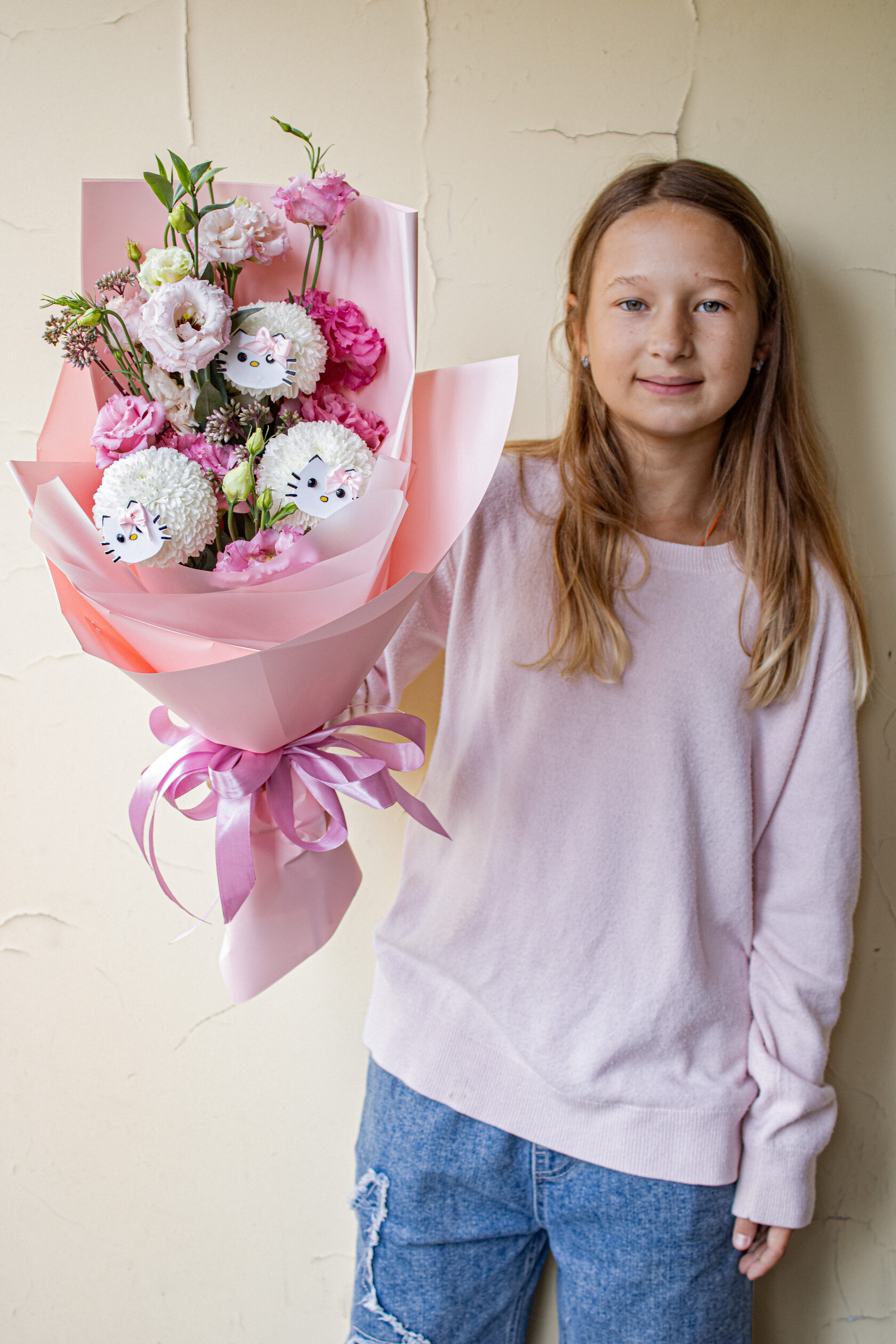 Состав букета: Хризантема мокко, эустома, евпаториум. Букет упакован в стильную упаковку розового цвета и перевязан шелковыми лентами.