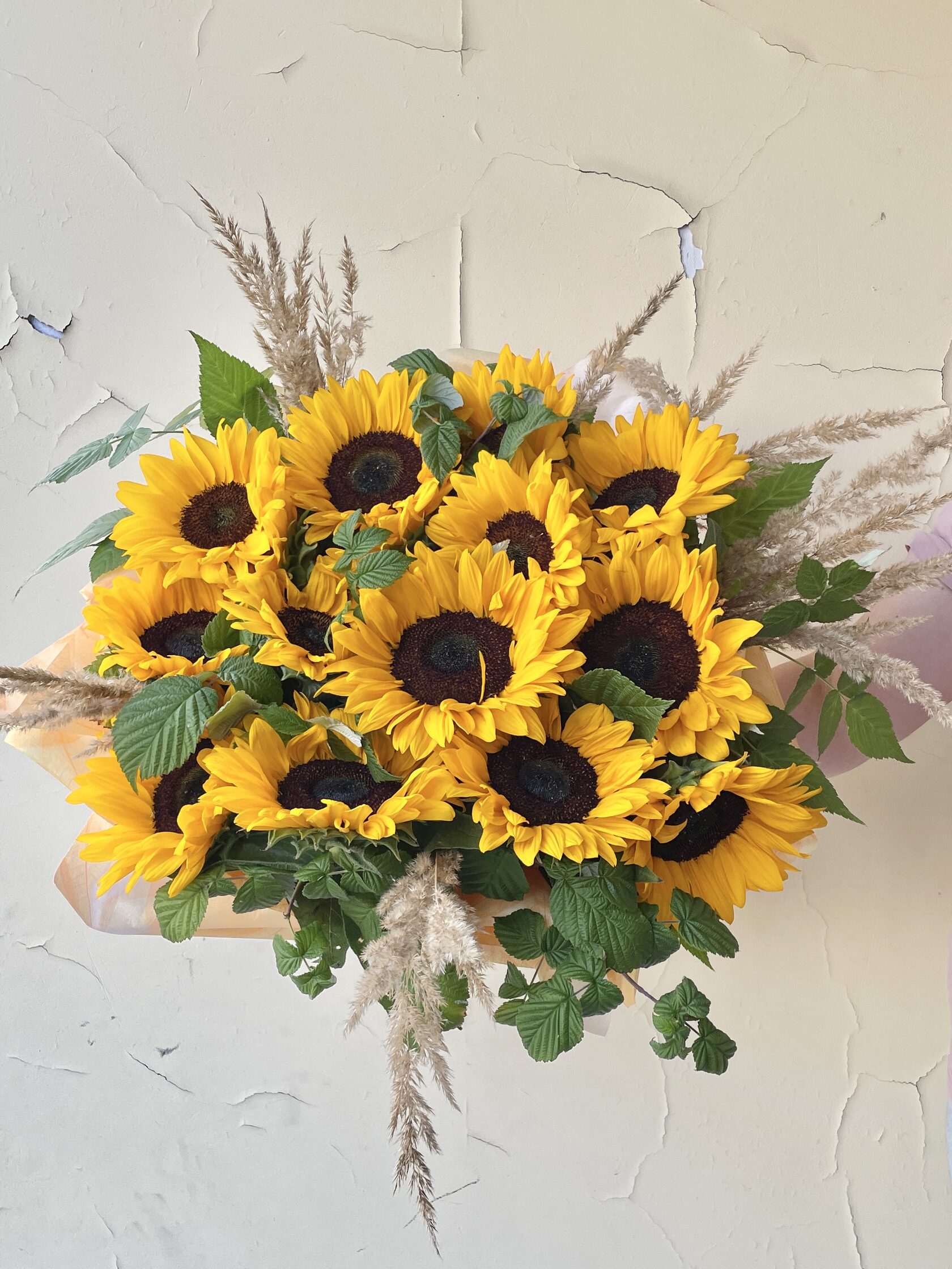 Состав букета: подсолнухи, голубая гортензия, персиковый диантус, солидага, гелениум.