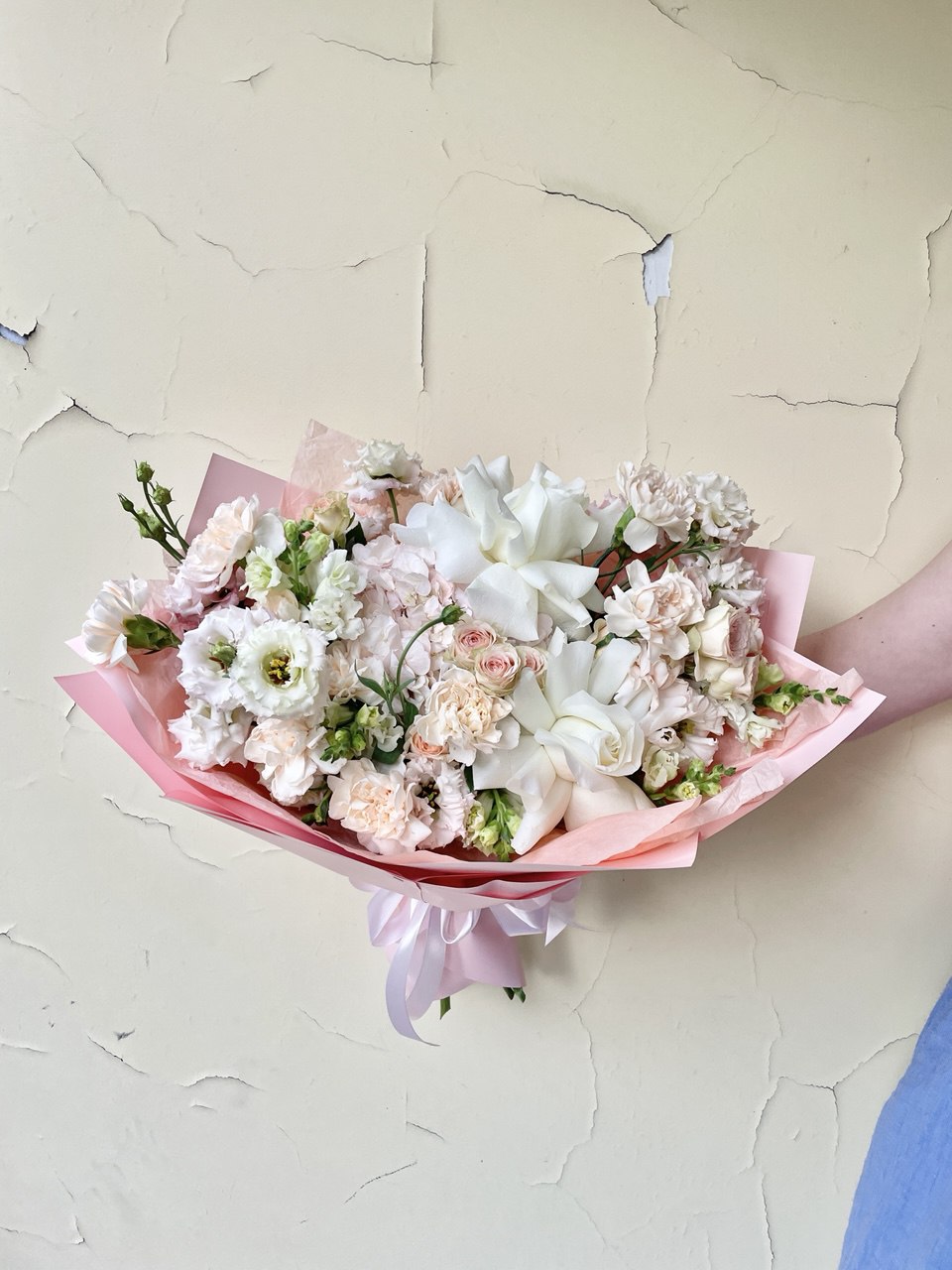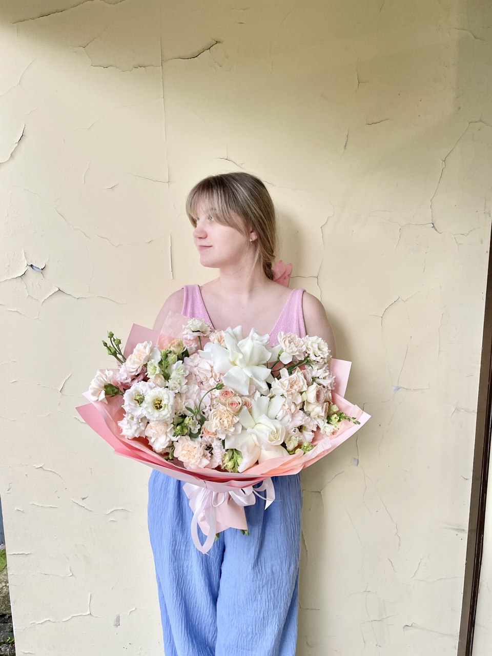 Состав букета: нежный кремовый диантус, белая эустома, персиковые кустовые розы, французские розы, гортензия, антирринум.