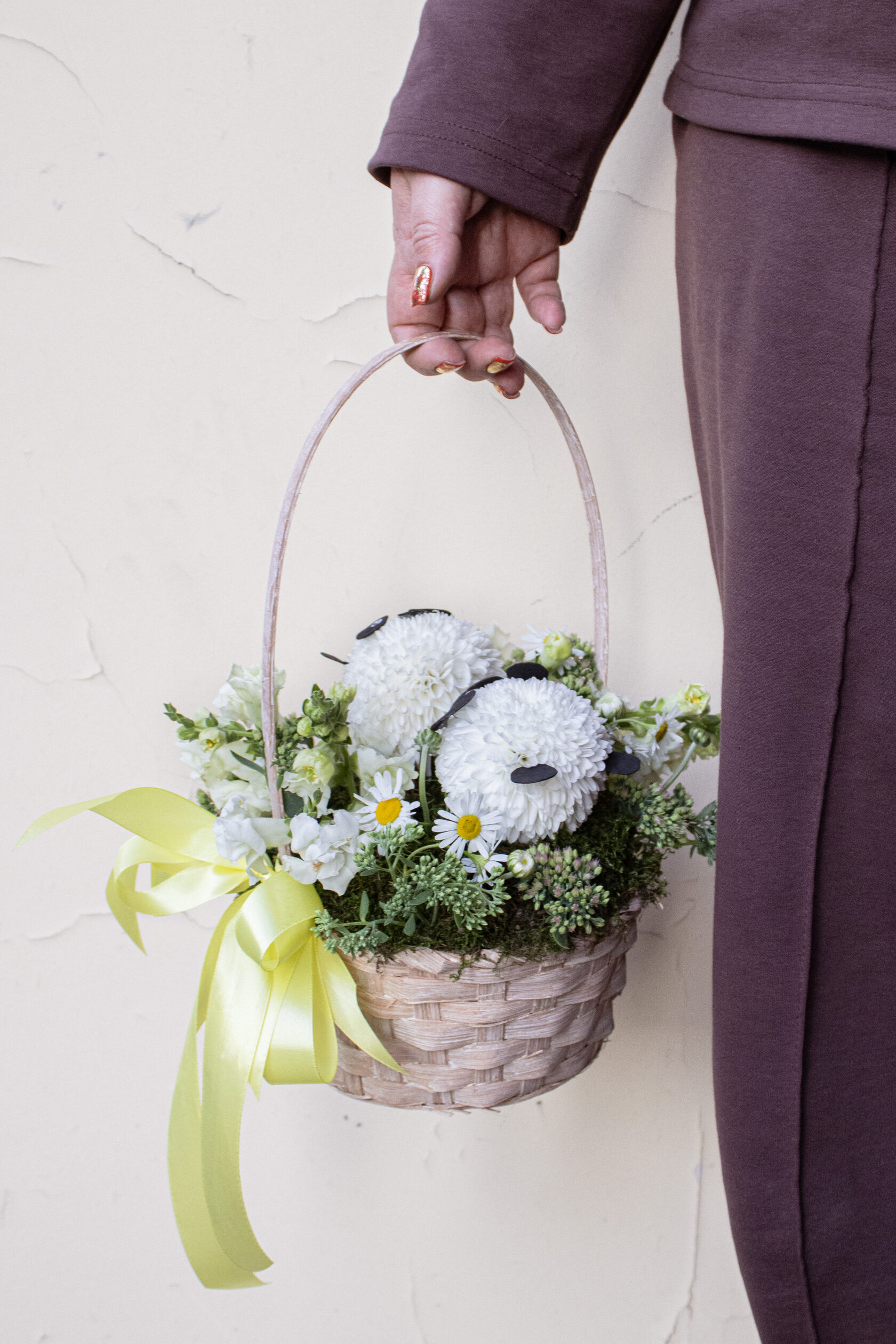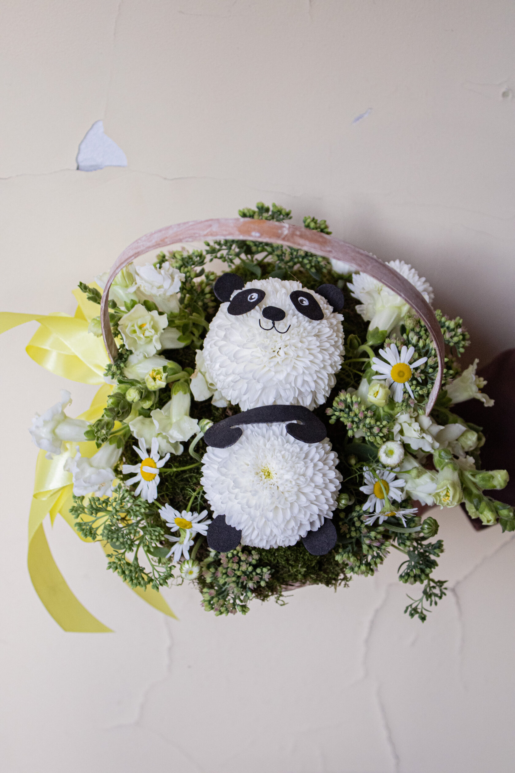 Состав букета: Хризантема мокко, седум, антиринум и зеленая мох. Композиция оформлена в плетёной корзинке.